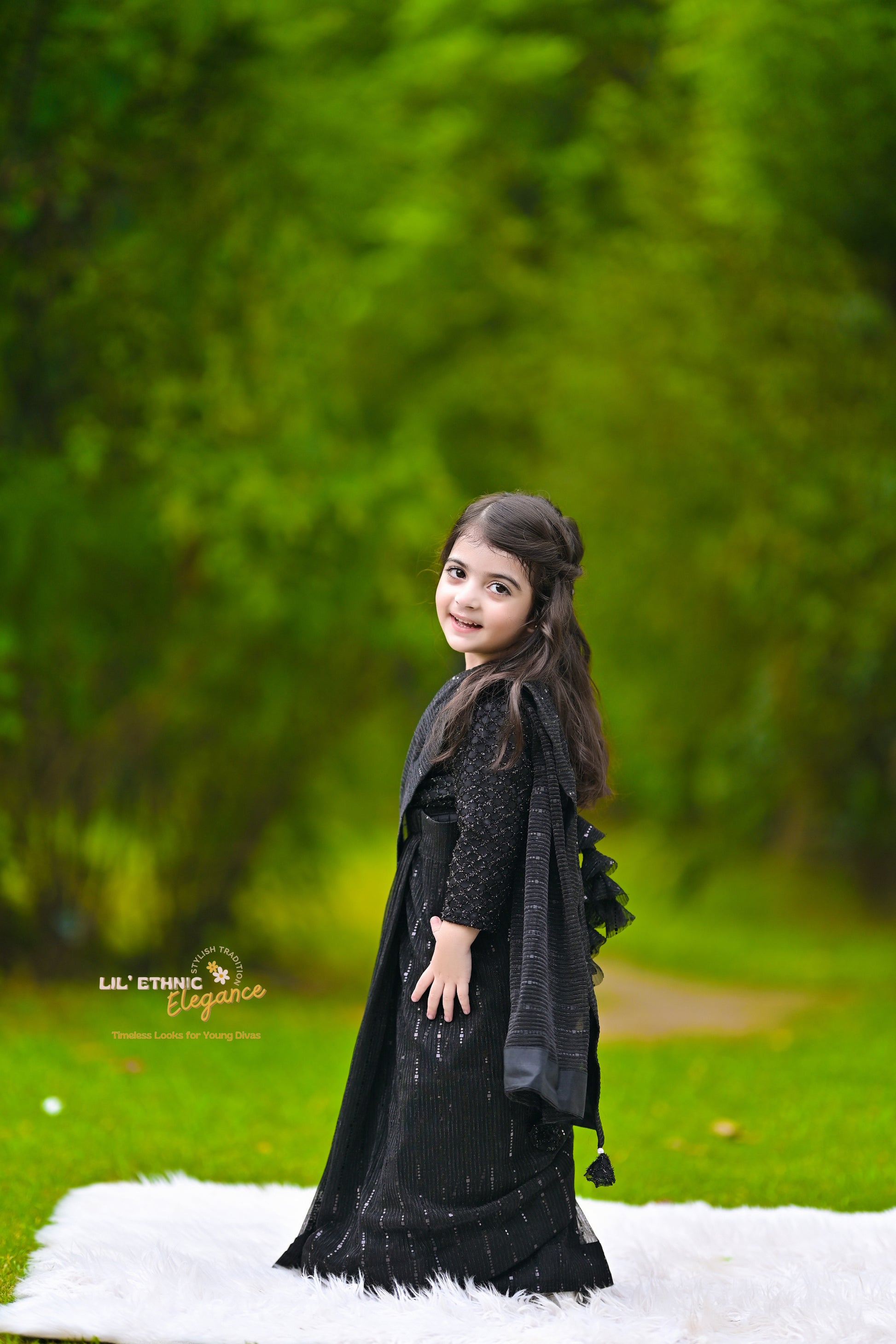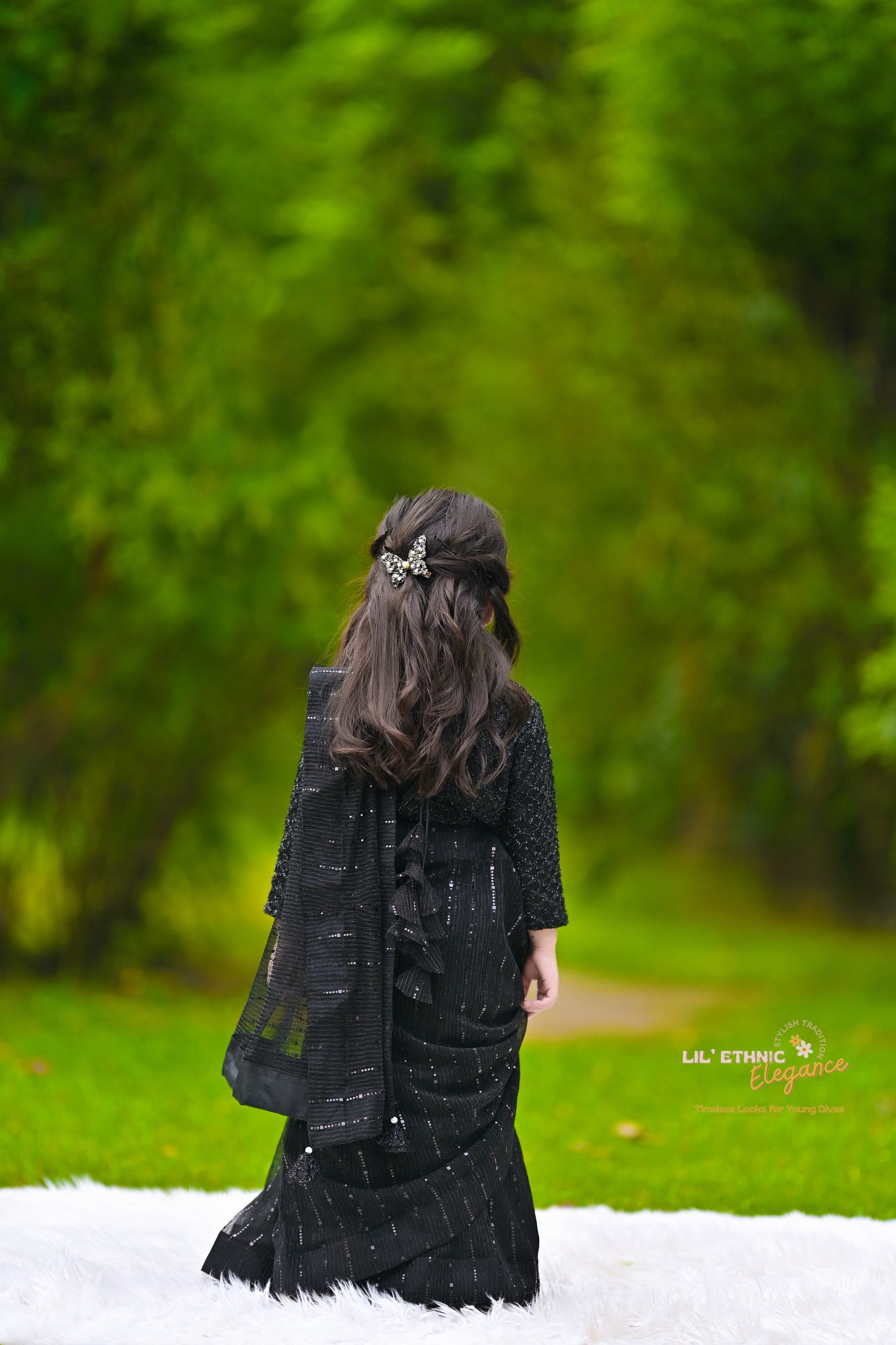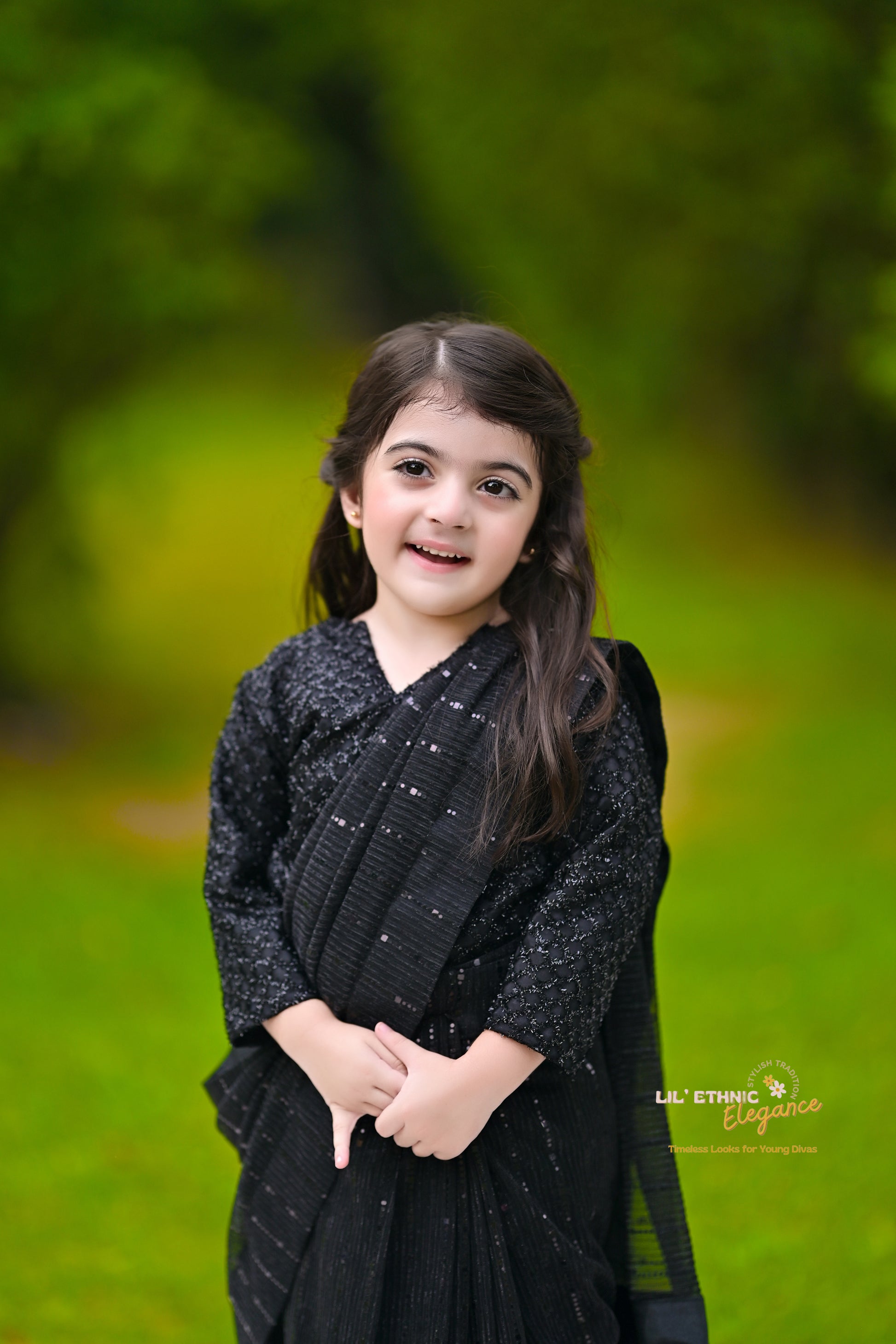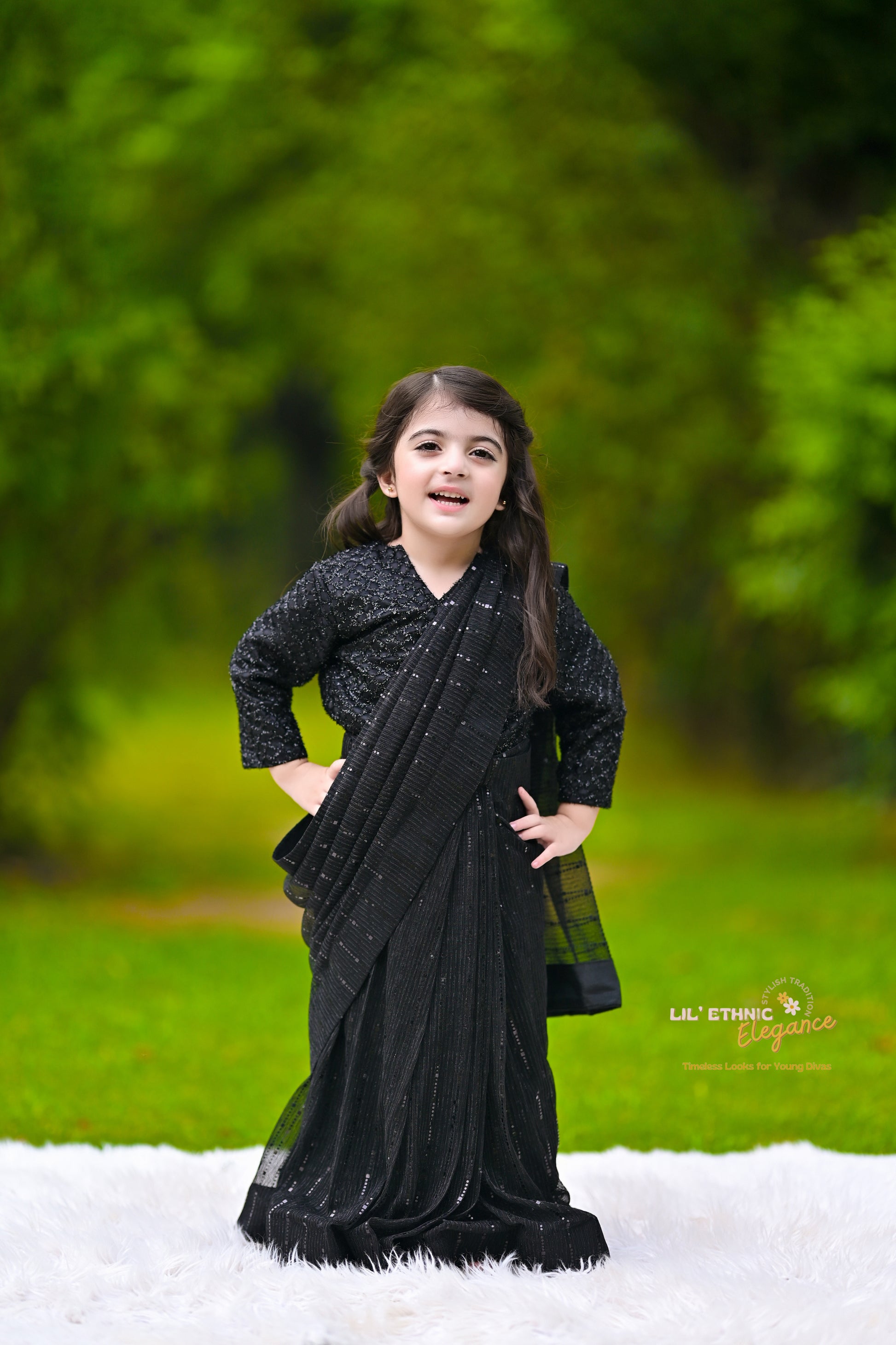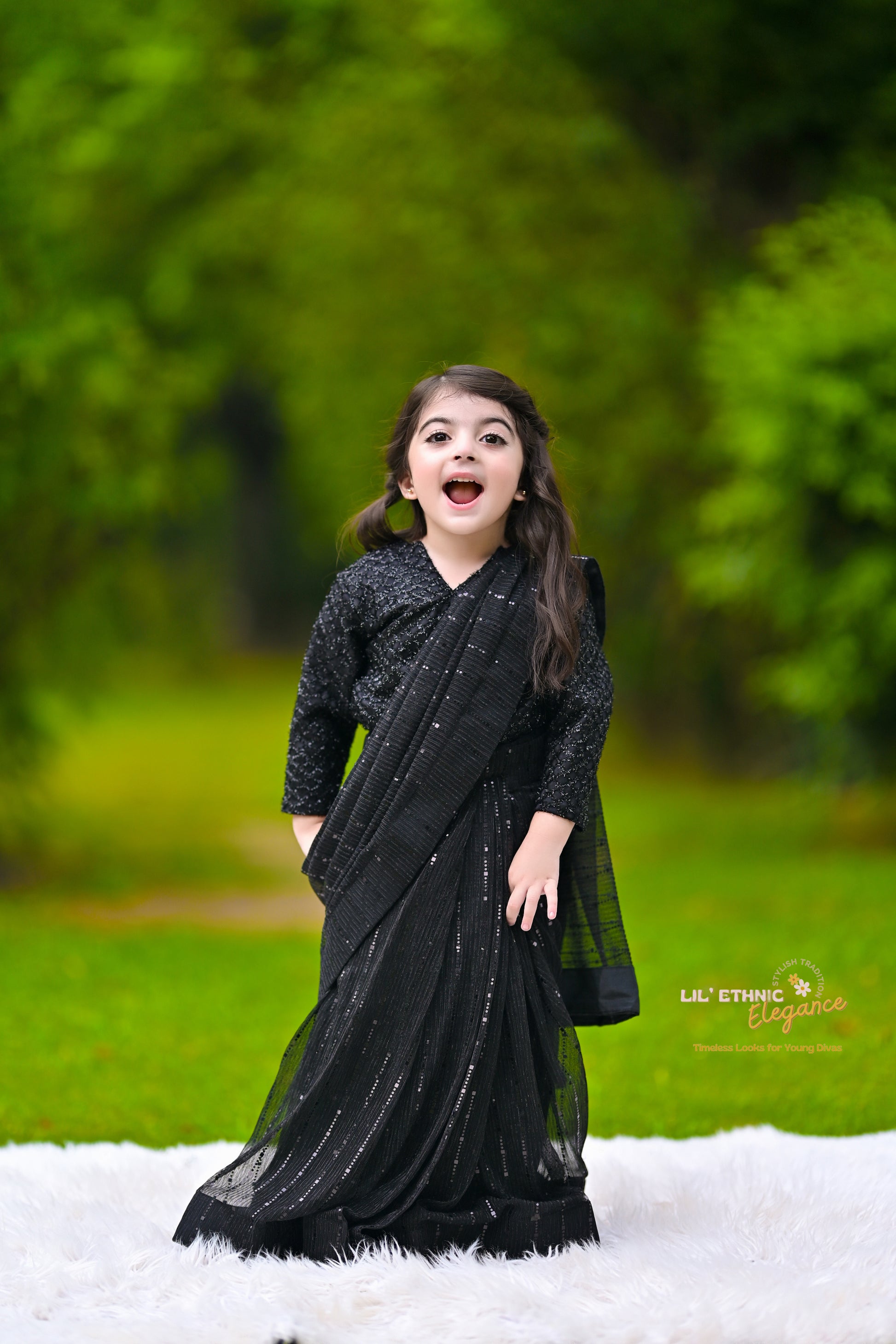 Stitched Moonlight Saree in Black Color: Dress your little angel in the magic of moonlight with this enchanting stitched saree! This stunning ensemble combines the warm glow of a black bodice with the rich elegance of a skirt, creating a look that’s both sophisticated and playful.