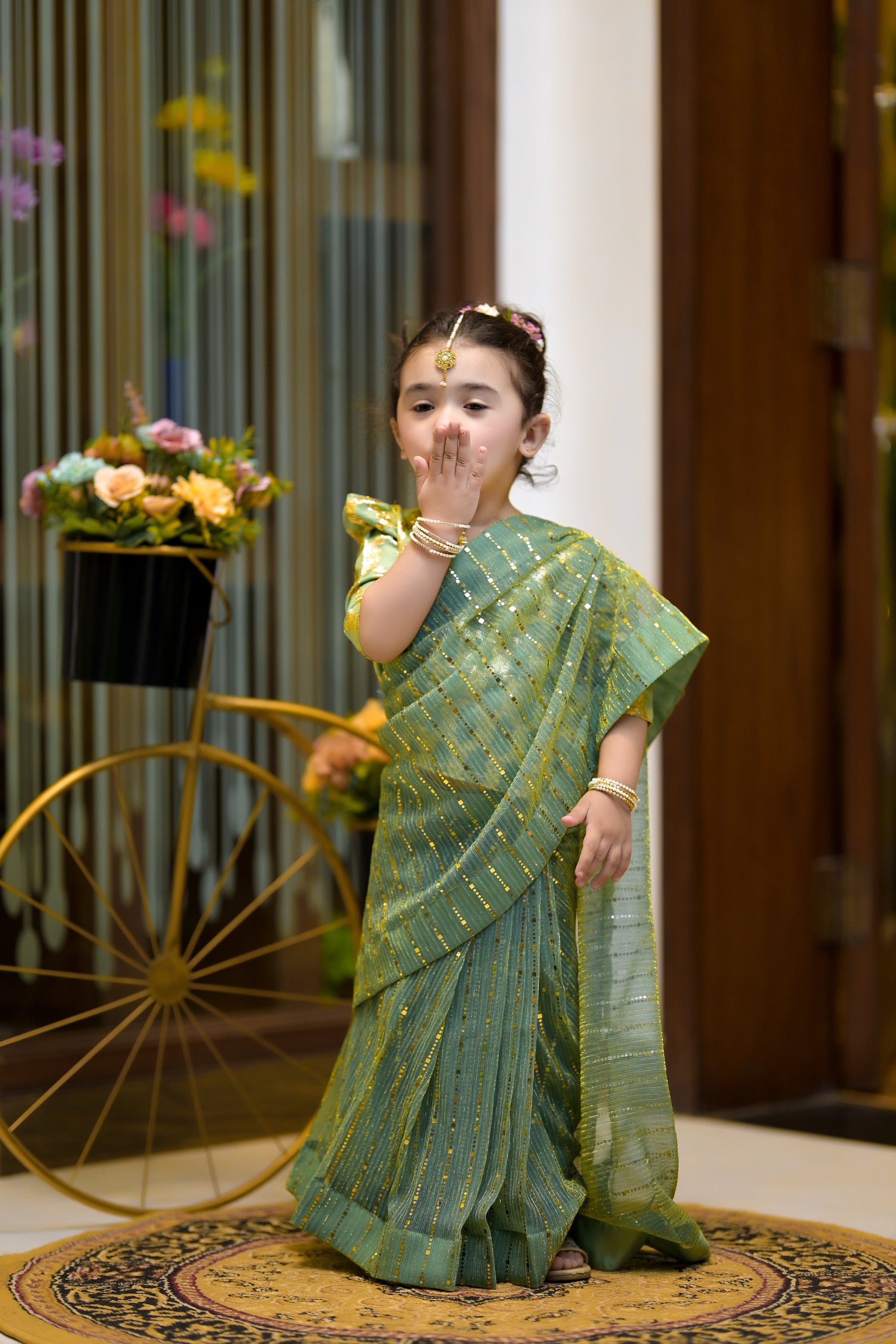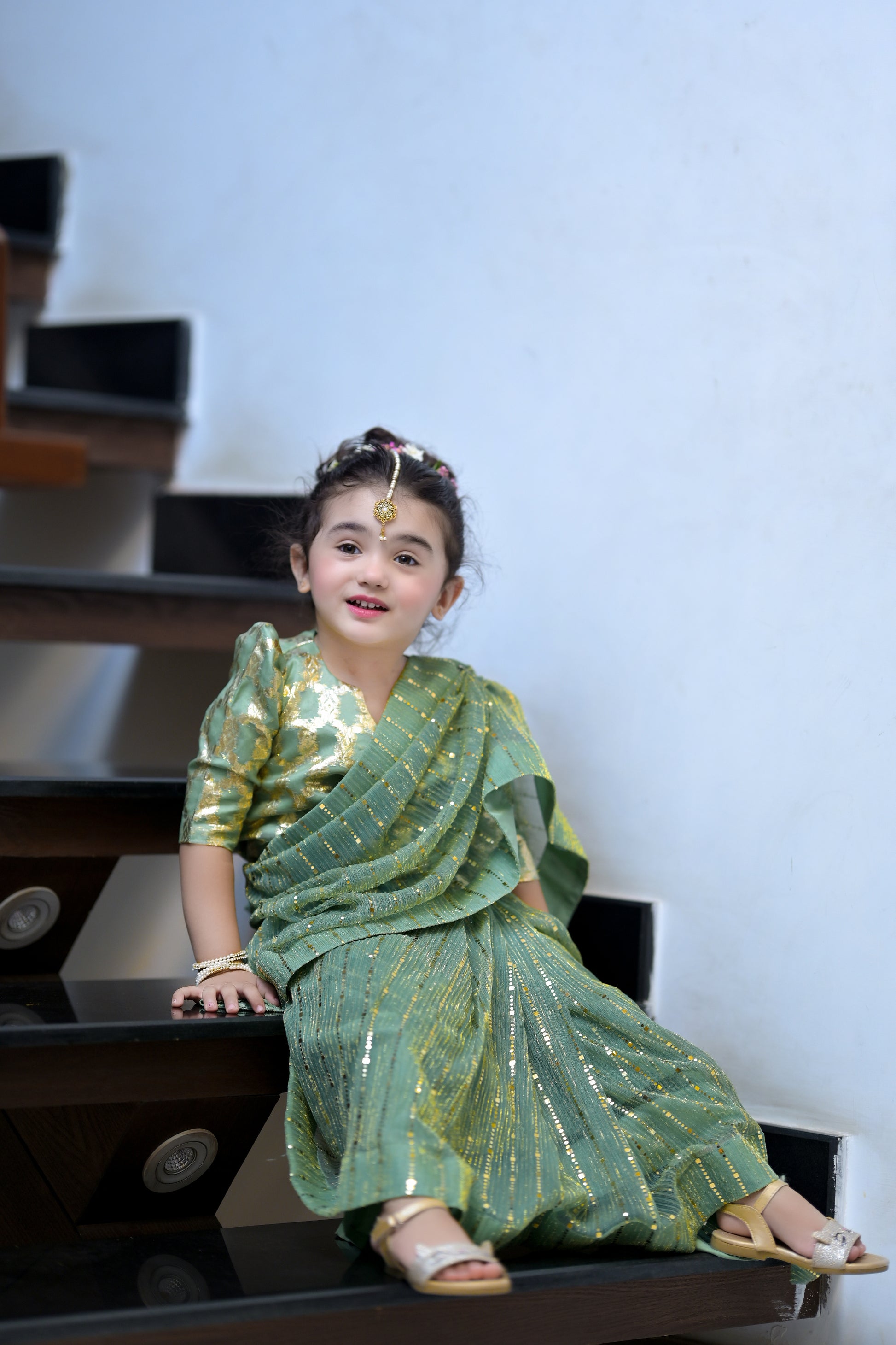 Stitched Moonlight Saree in Green Color: Dress your little angel in the magic of moonlight with this enchanting stitched saree! This stunning ensemble combines the warm glow of a green bodice with the rich elegance of a skirt, creating a look that’s both sophisticated and playful.