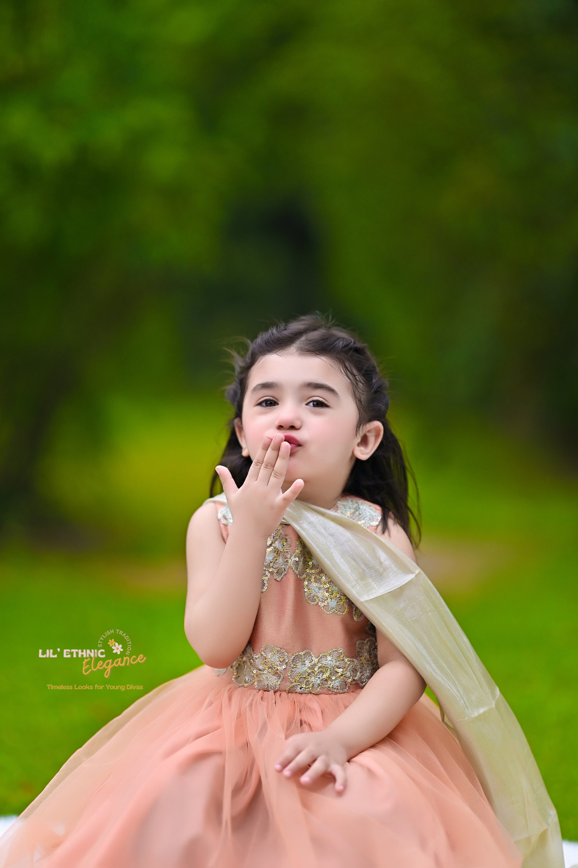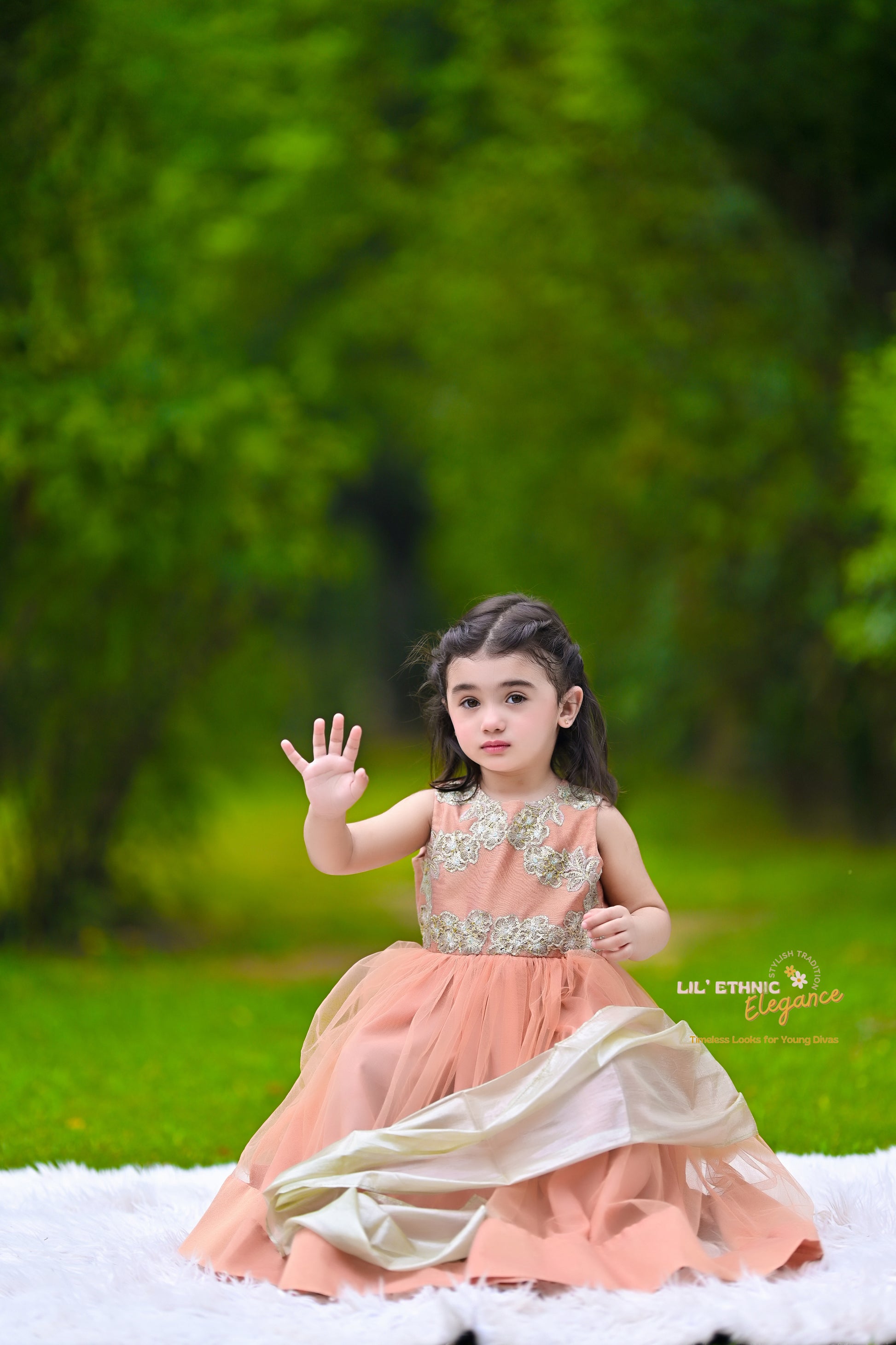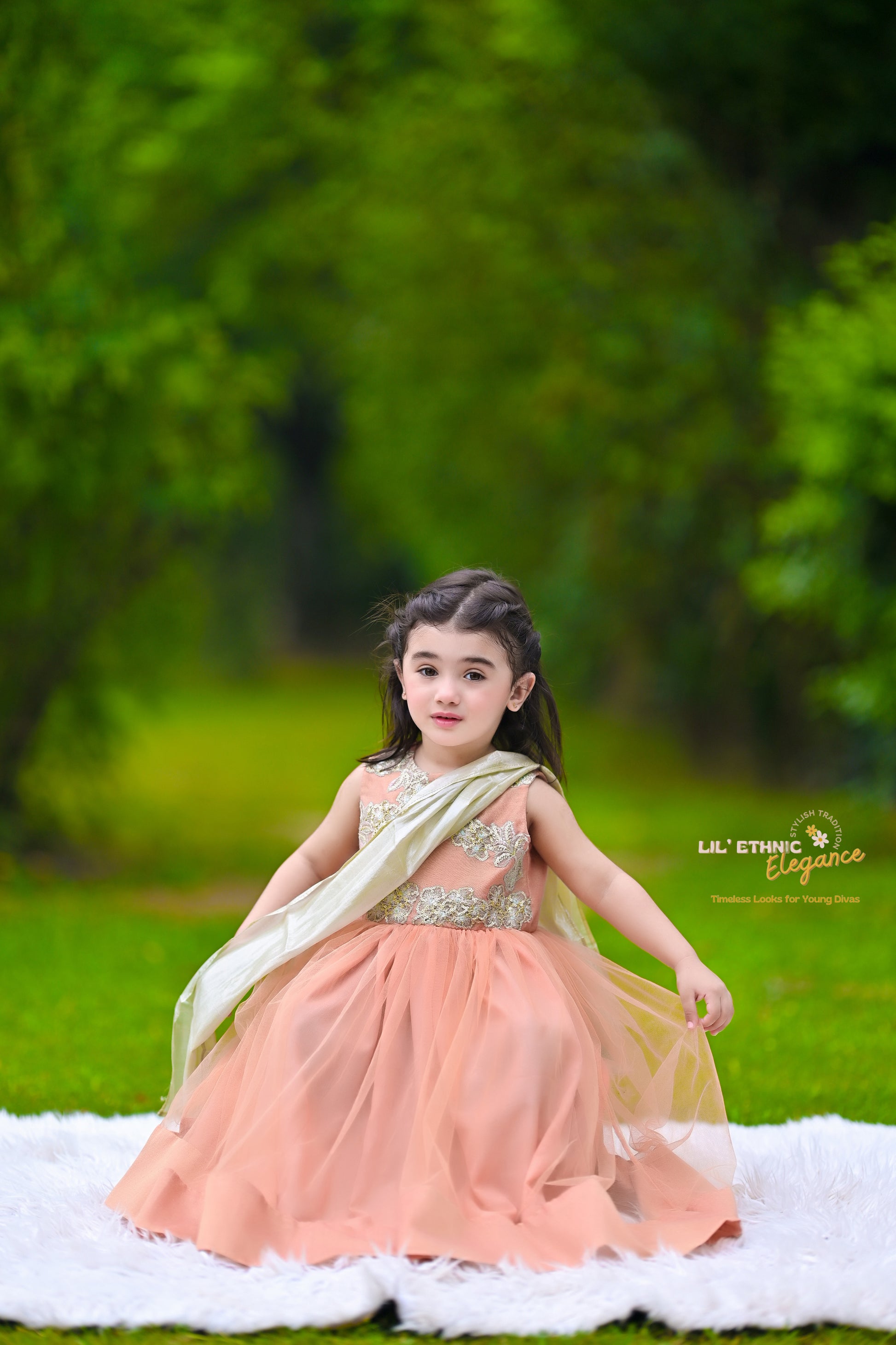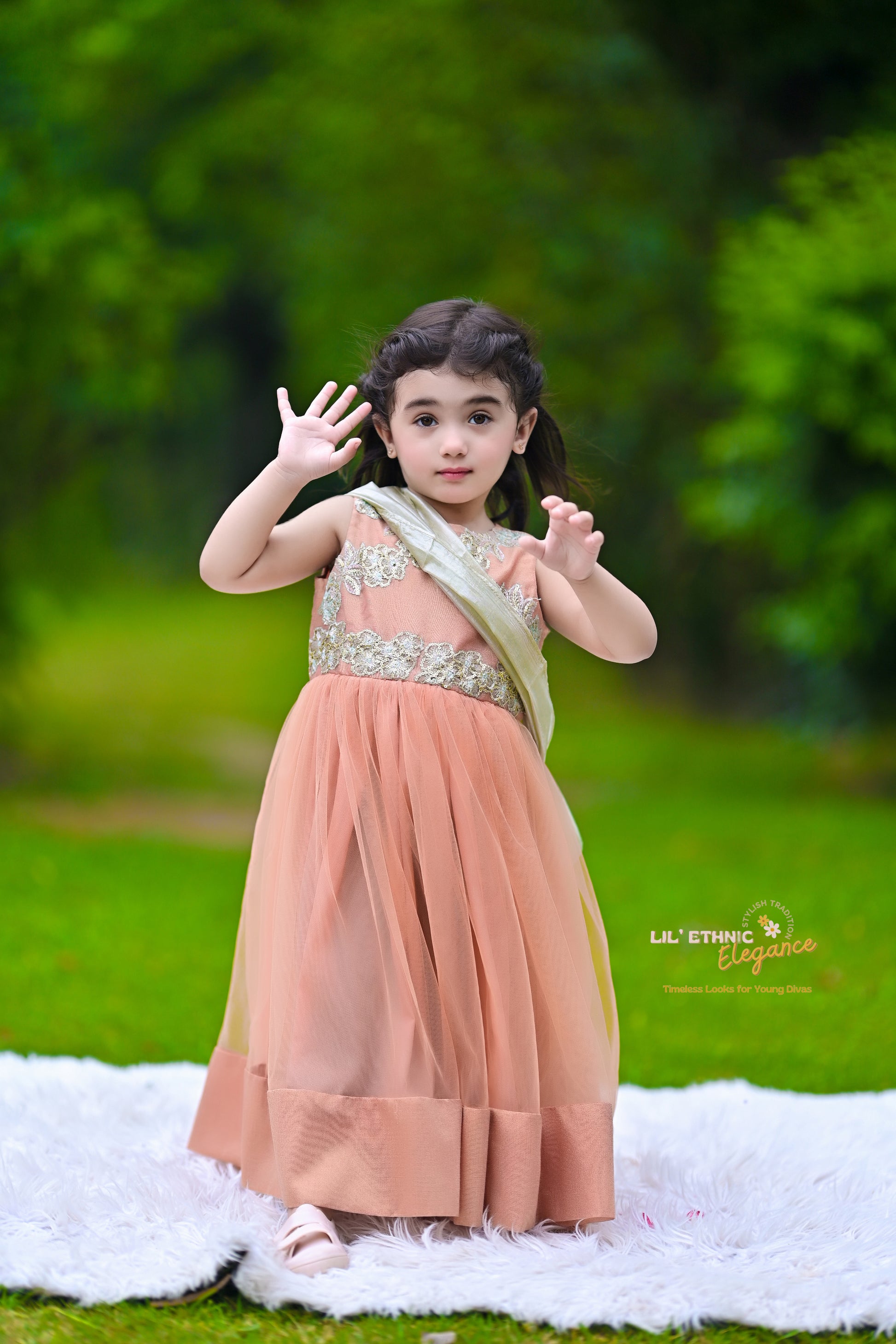 Stitched Sleeveless Frock in Peach Color: Dress your little princess in this enchanting Peach Dream Frock Set, perfect for any special occasion. Designed with elegance and comfort in mind, this outfit includes: