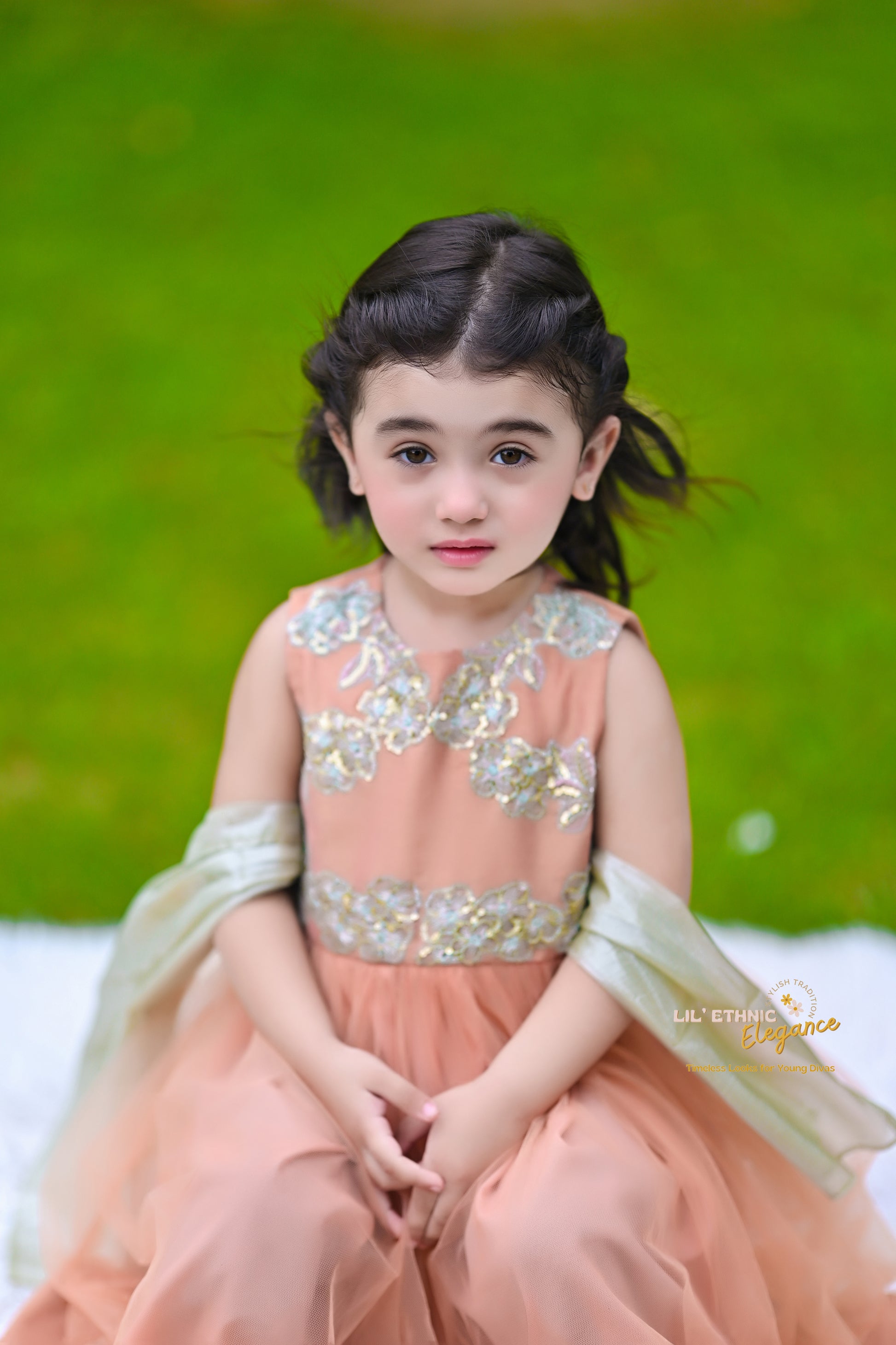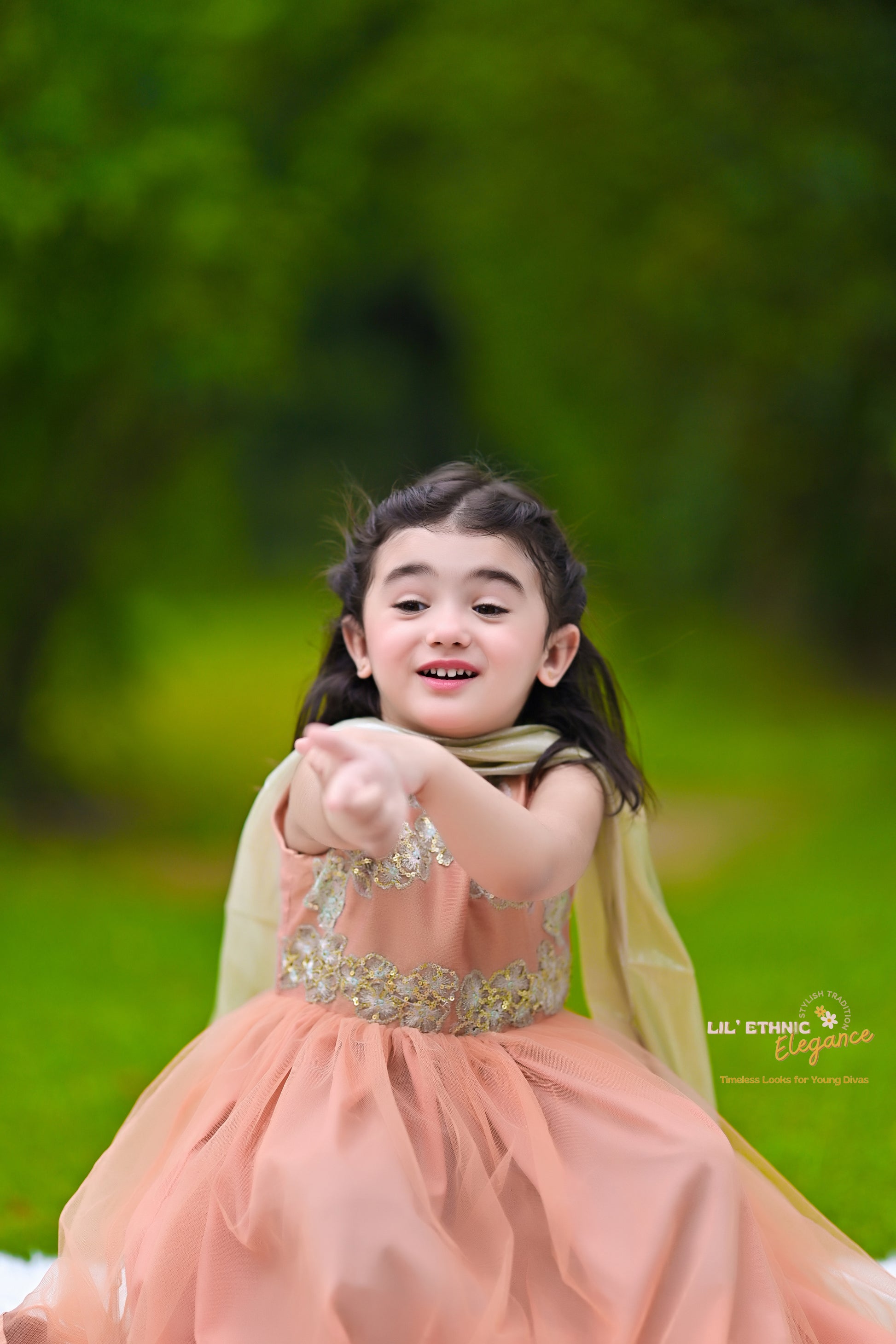 - Stitched Frock: A beautifully crafted frock in a soft peach hue with delicate lace detailing, creating a timeless and graceful look.